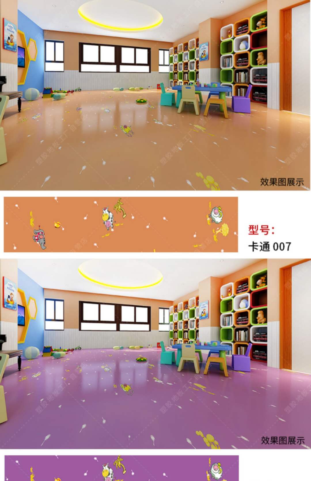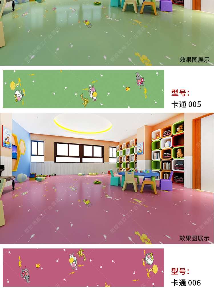 卡通pvc塑膠地板花型是近幾年來非常流行的花紋,不僅五顏六色而且還有各種卡通的圖案,因此獲得幼兒園的老師們一致好評,它不僅可以讓教室的地面五顏六色,而且還有各種卡通圖案,不僅可以刺激小朋友的視覺神經而且還可以讓小朋友們認識各種小動物,下面分享幾款我們工廠生產的卡通圖案給大家,有需要電話聯系: